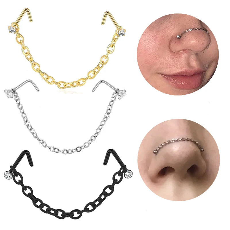 1pc Nose Ring With Chain Double Piercing Nose Stud Zircon L Shaped Stainless Steel Nostril Body Jewelry