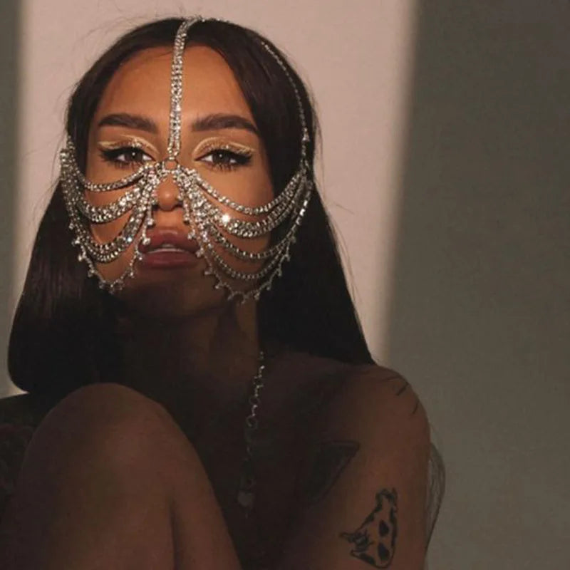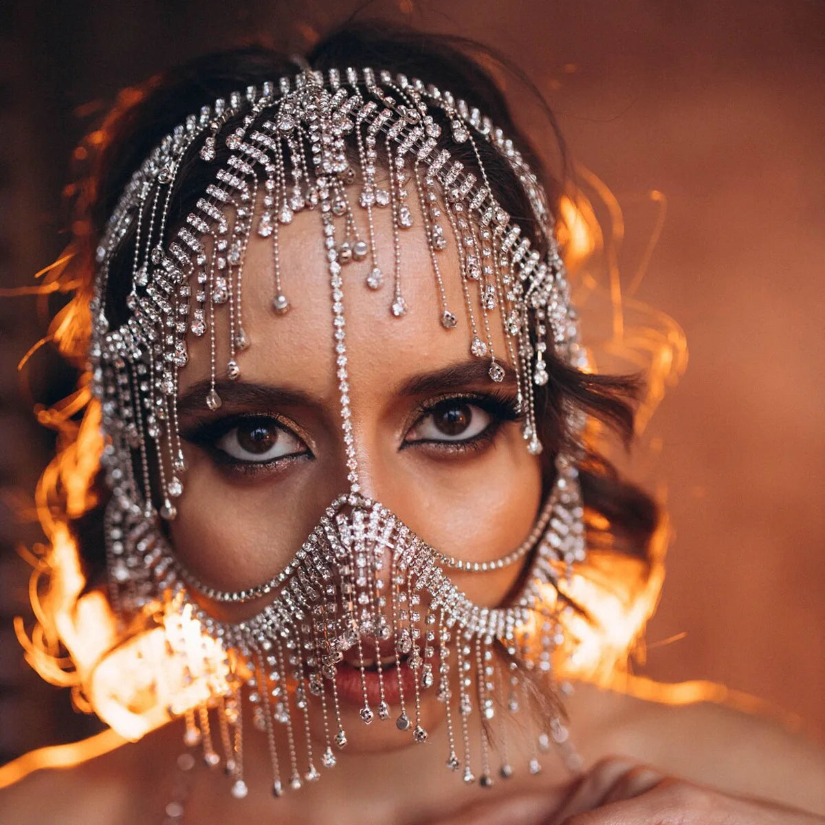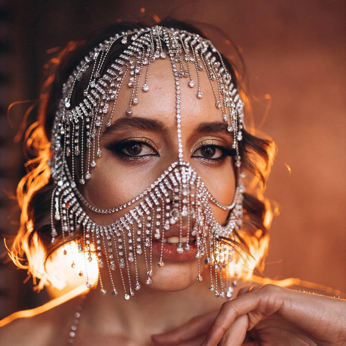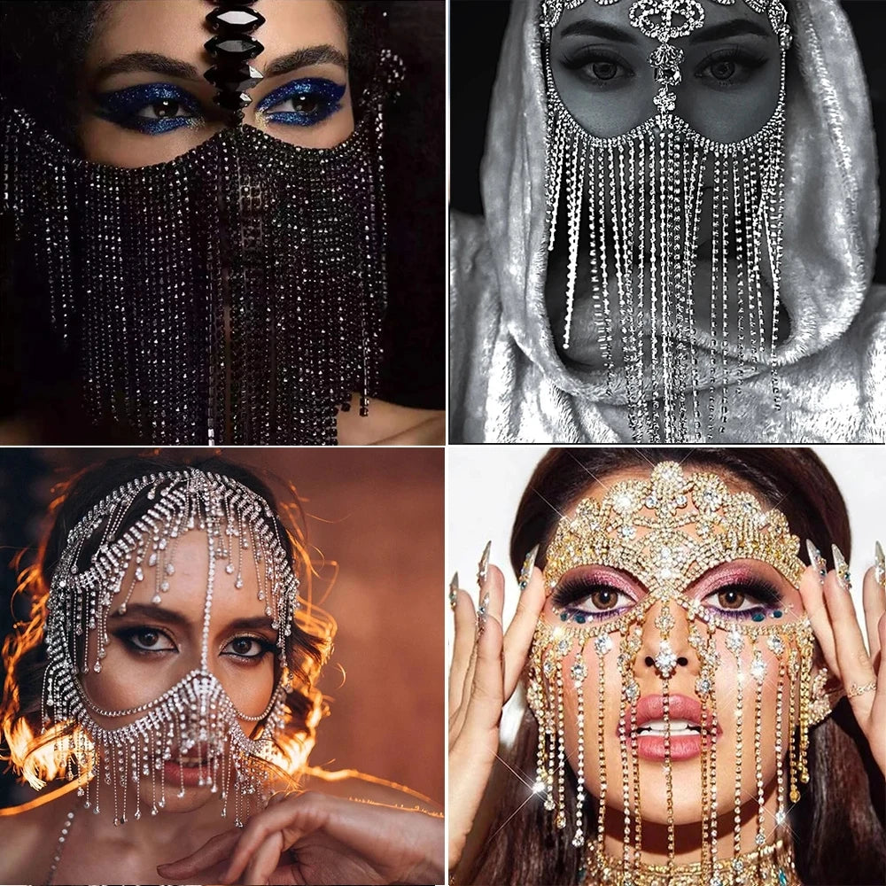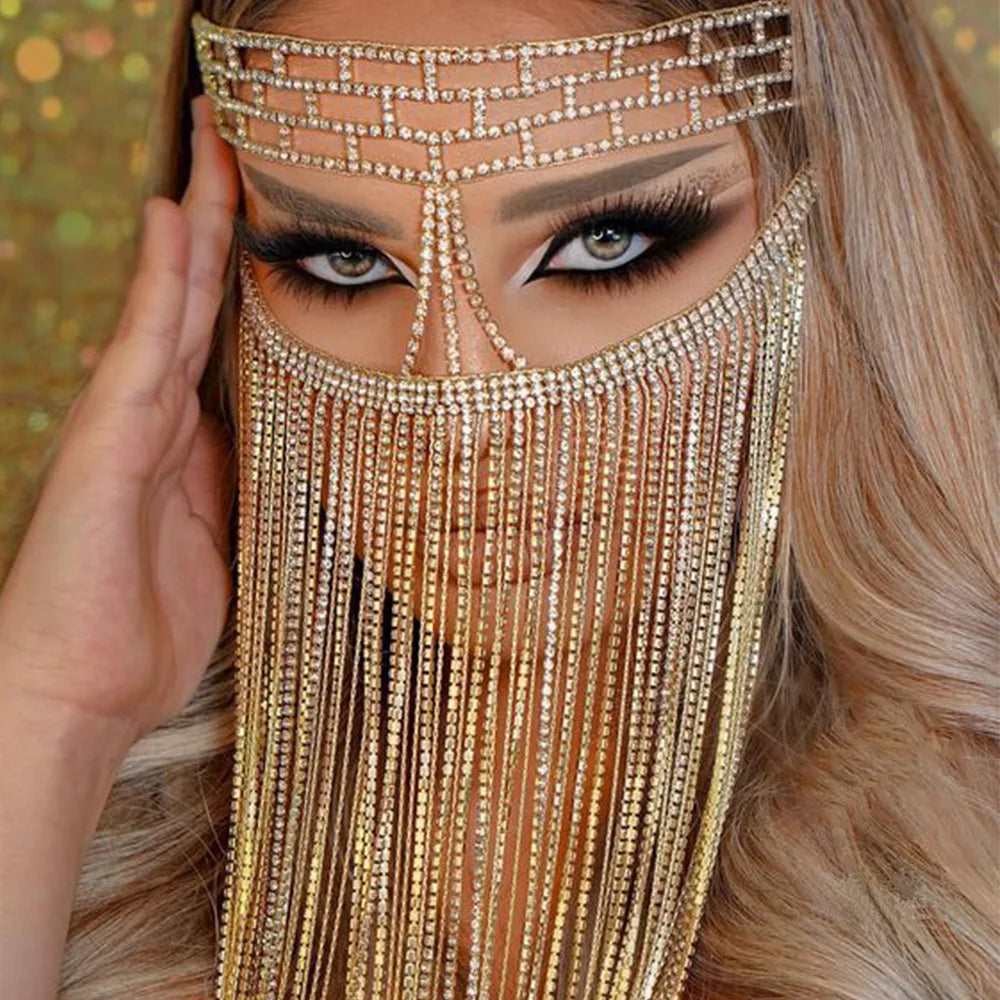 Fashion Charming Rhinestone Tassel Veil Masks for Women Bohe Face Jewelry Chain Masquerade Dance Party Sexy Costume Accessories
