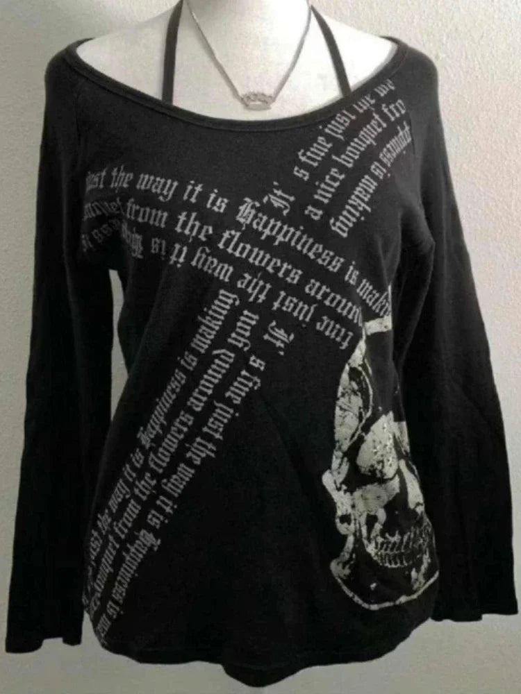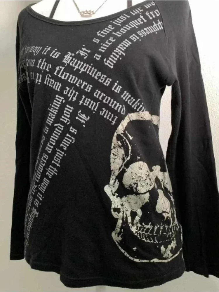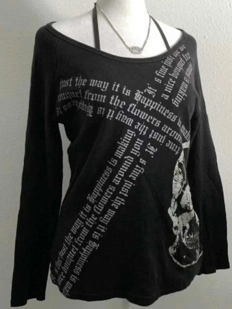 Harajuku T Shirts Women Skull Print Slash Neck Y2k Tops Fashion Gothic 2000s Vintage Tees Streetwear Punk Letter Black Tshirts
