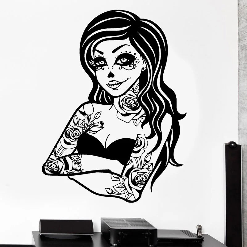 Horror Gothic Tattoo Dead Girl Wall Sticker Vinyl Art Home Decor for Boys Teens Room Decals Halloween Decoration Wallpaper G074
