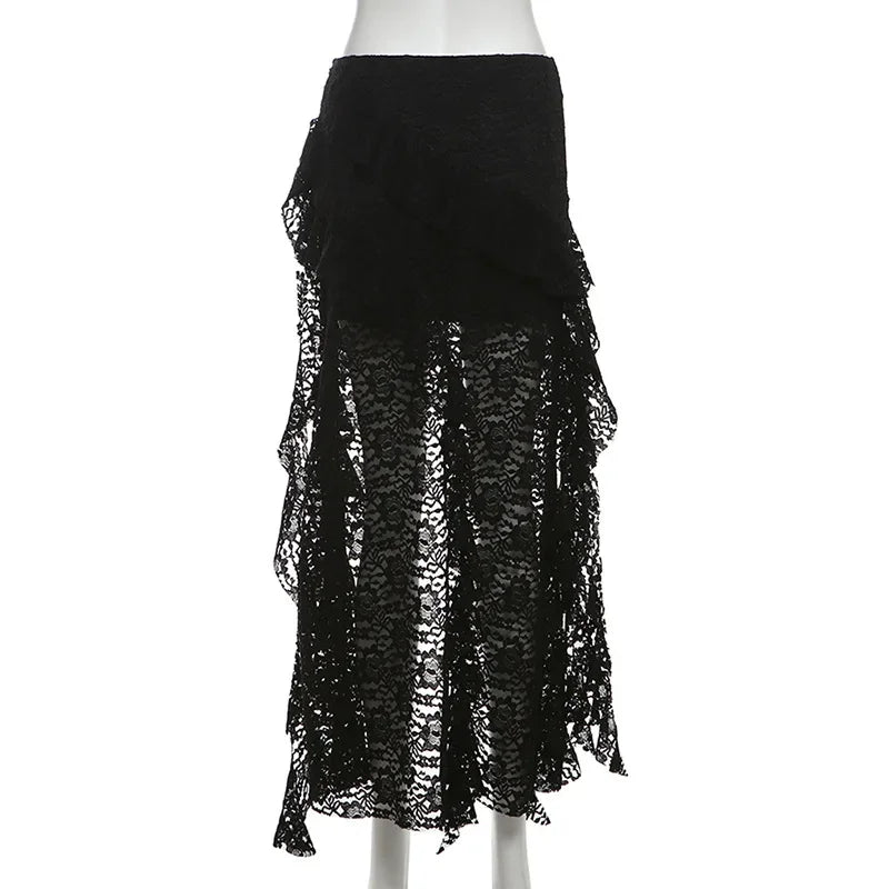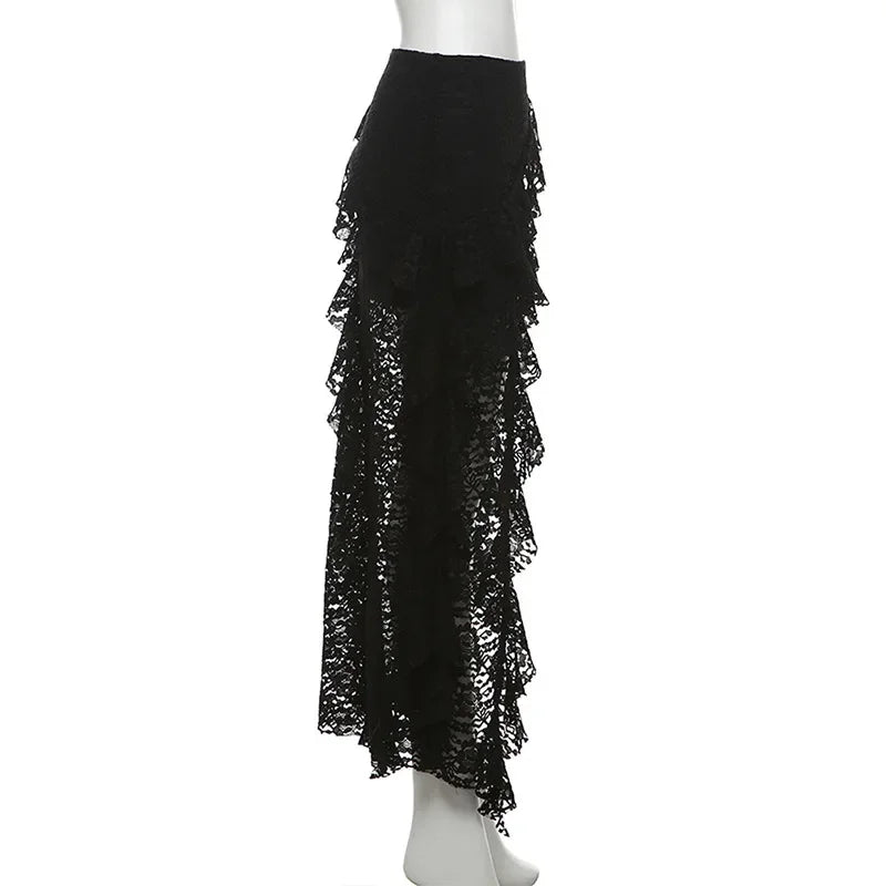 Sexy High Waist Lace Ruffles Skirts Women 2025 Spring Irregular Y2k Skirts Women Fashion Black Patchwork Party Clubwear Gothic