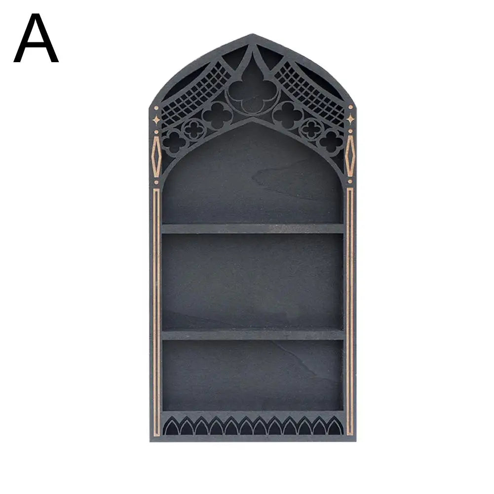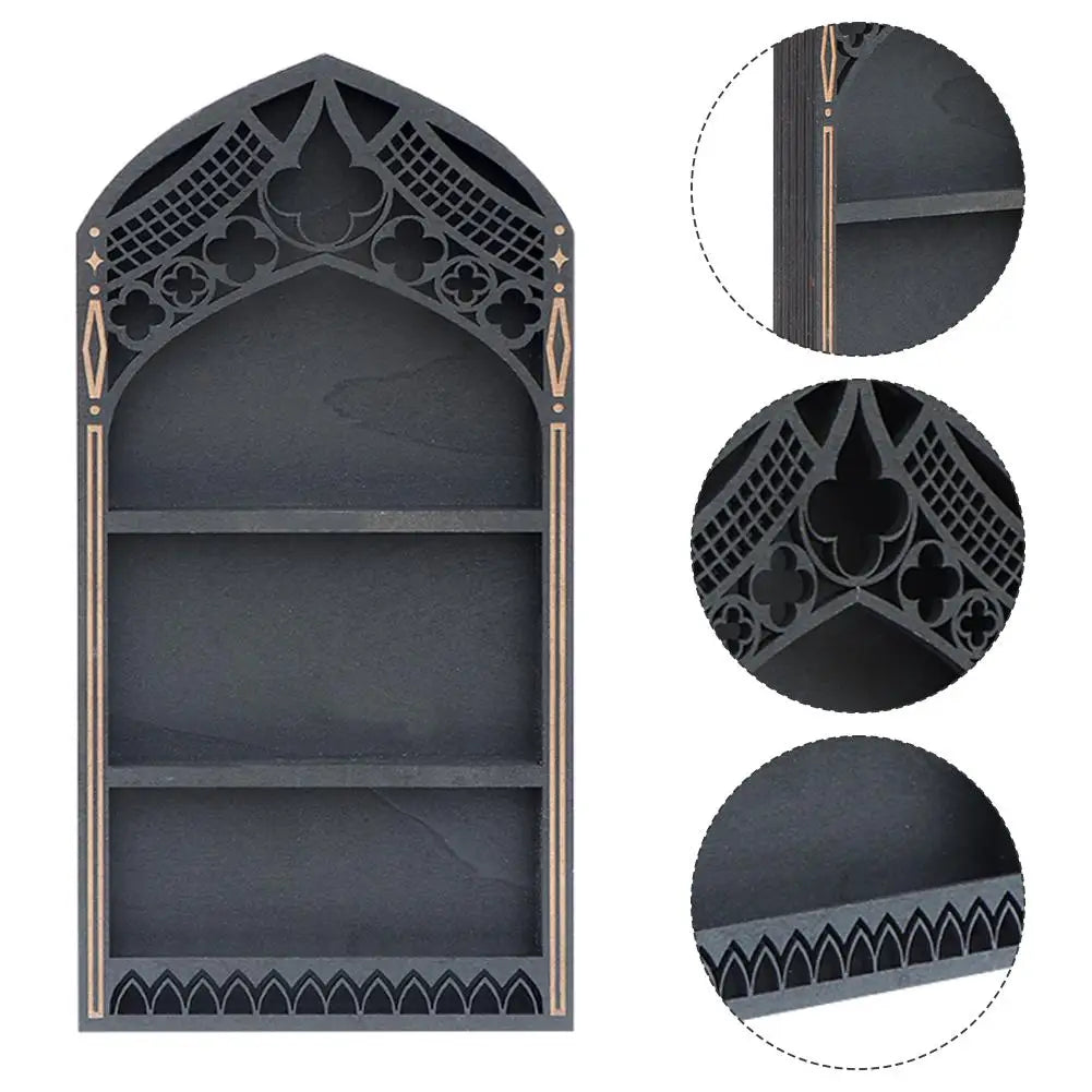 Wall Display Shelf Wood Church Window Design Stones Holder Black Wooden Shelf For Wall For Office Gothic Room Decoration